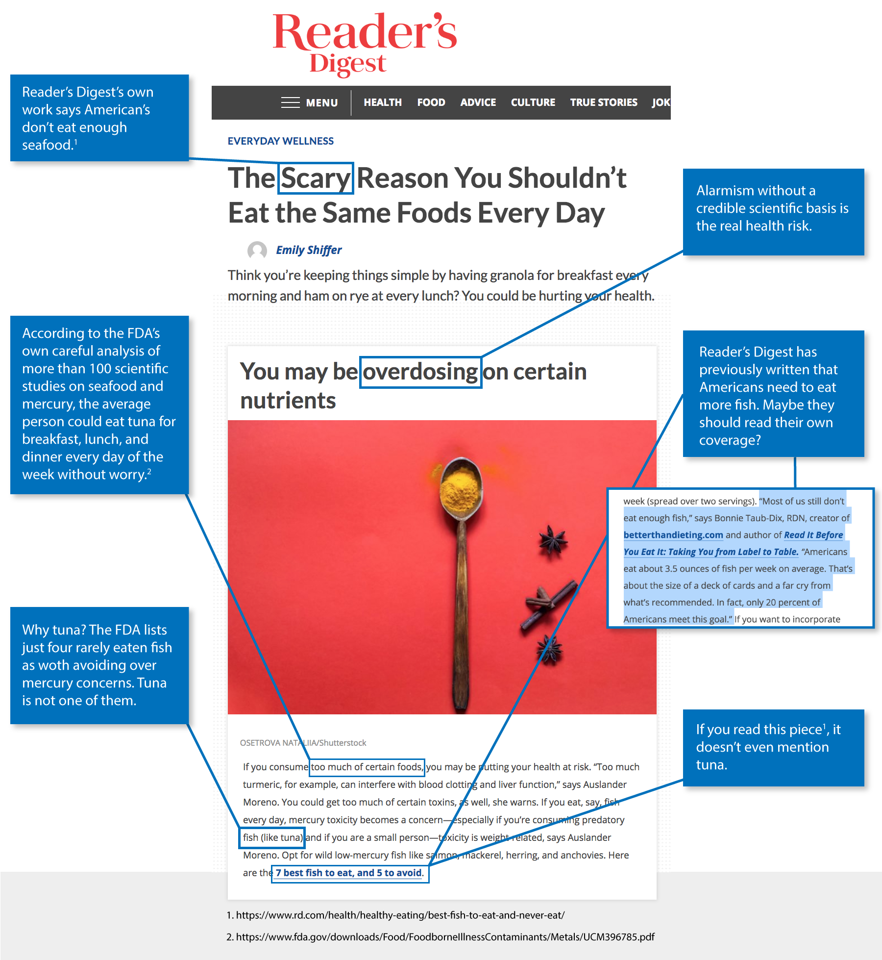 Reader’s Digest’s recent post [The Scary Reason You Shouldn’t Eat the Same Foods Every Day, by Emily Shiffer, 1/23/19] poses just such a threat. Ms. Shiffer tells readers it’s “scary” to eat too much of the same foods, and singles out tuna as specifically dangerous due to concerns over mercury. But there is no reason to limit tuna consumption due to mercuy, and indeed the only piece she cites in support, written by one of her own colleagues, doesn’t even mention tuna.